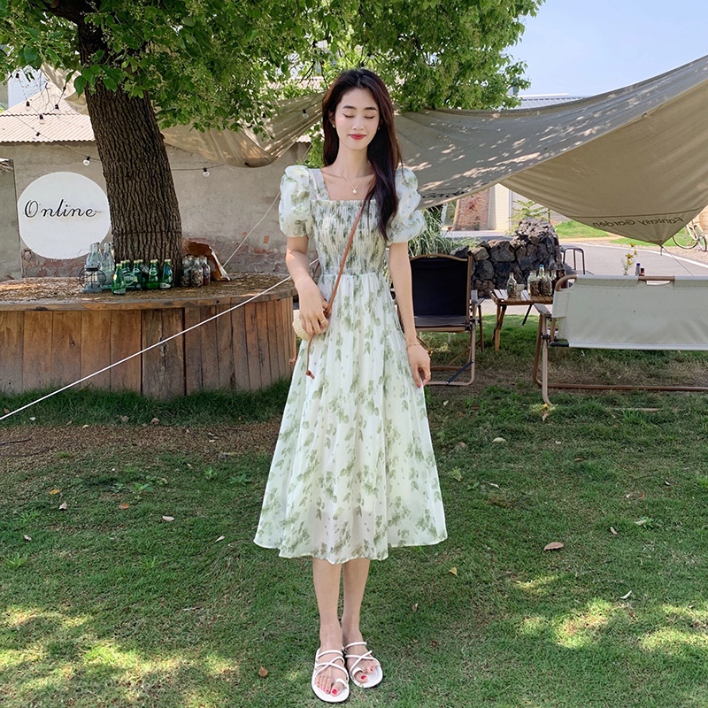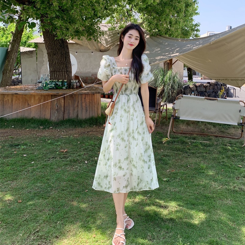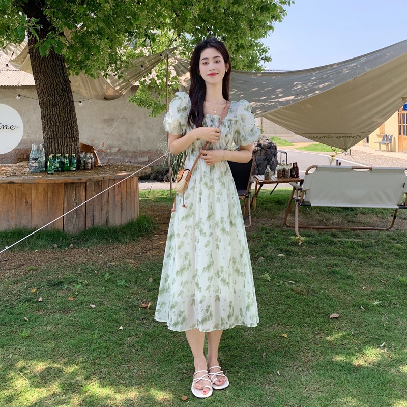 小个子碎花雪纺连衣裙女夏季2025新款泡泡袖收腰显瘦气质a字裙子