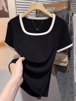 方领撞色T恤女短袖韩系纯欲修身辣妹漂亮小众气质冰丝上衣打底衫
