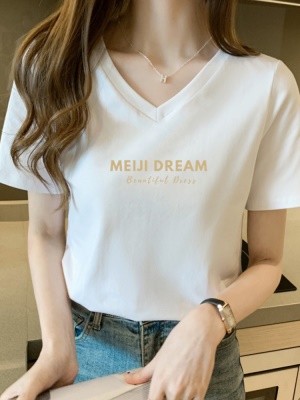 2025新款V领正肩纯棉短袖T恤女白时尚百搭减龄显瘦上衣打底衫夏季