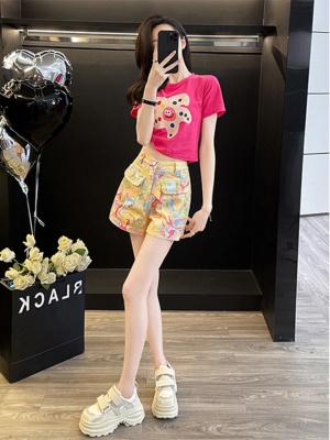 多巴胺休闲运动套装女夏季炸街洋气时尚短袖花色牛仔短裤两件套潮