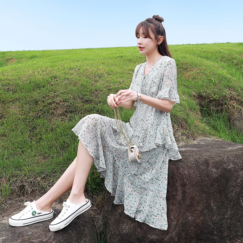 小清新雪纺碎花连衣裙女2025新款夏天收腰显瘦气质v领蛋糕a字裙子