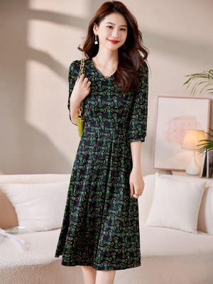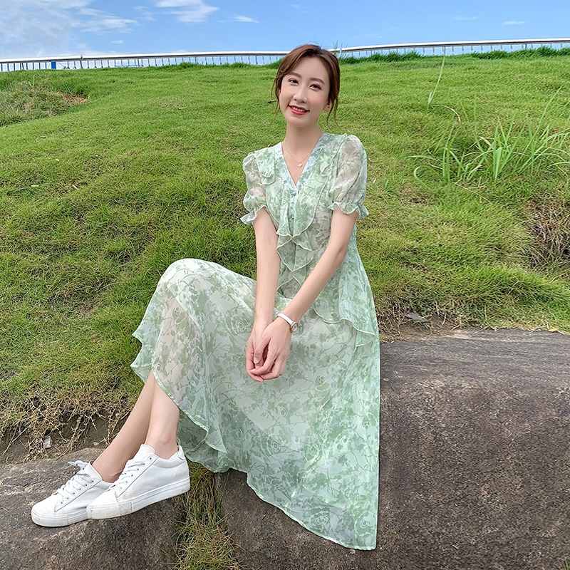 绿色温柔风雪纺碎花连衣裙女夏季2025新款收腰显瘦气质a字裙子仙