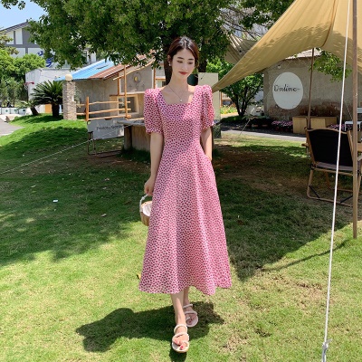 红色碎花雪纺连衣裙女夏季2025新款方领气质收腰显瘦中长a字裙子