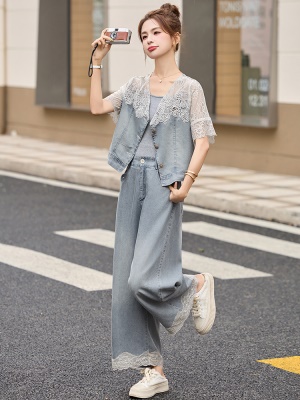 欧货蕾丝拼接休闲套装女夏2025新款设计感时尚五一出游穿搭三件套