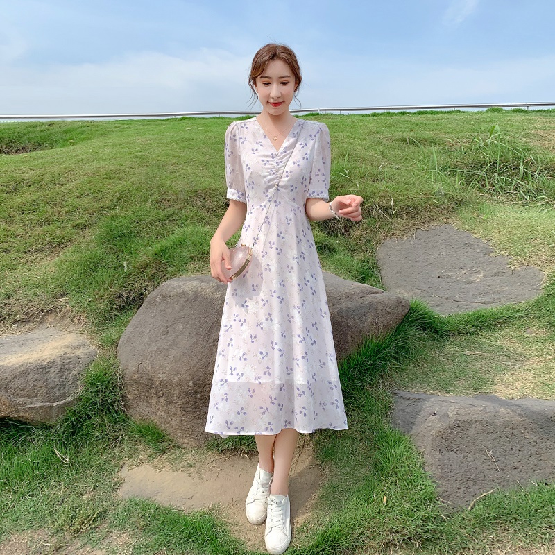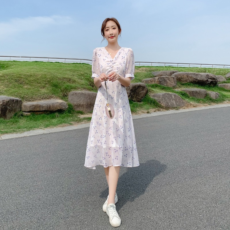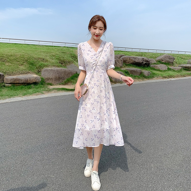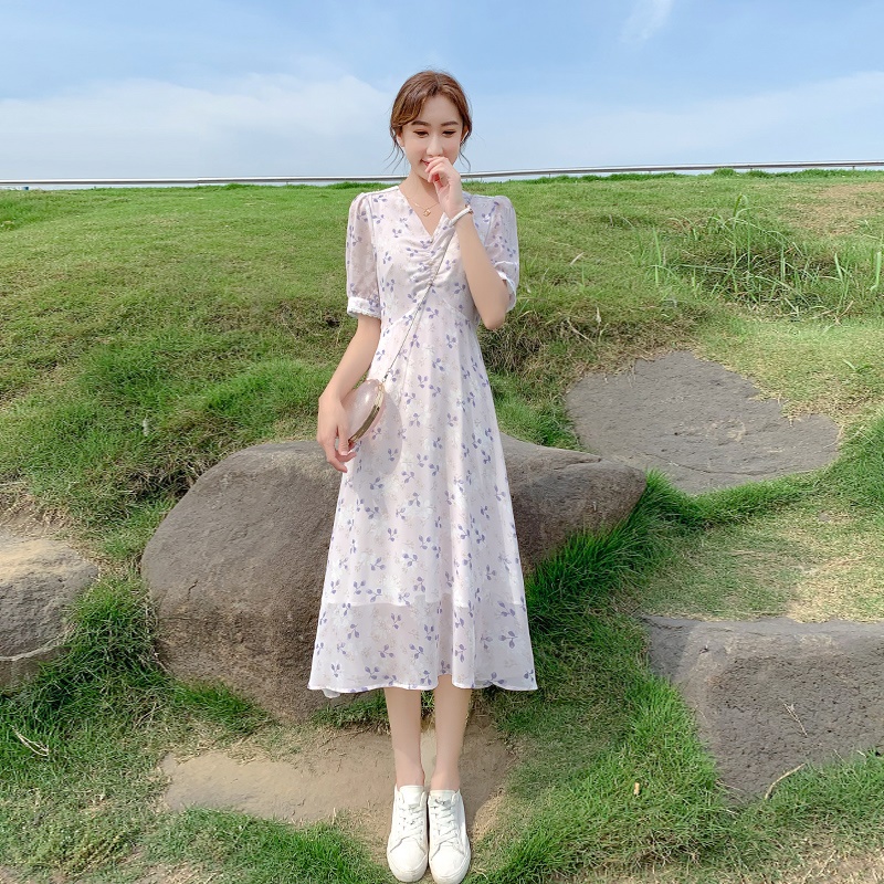 温柔风雪纺碎花连衣裙女夏季新款2025气质显瘦收腰a字裙子紫色仙