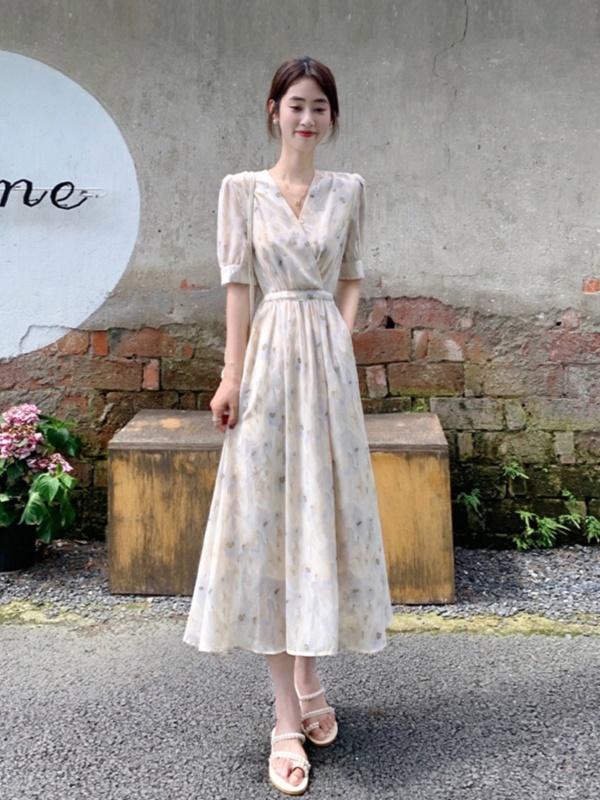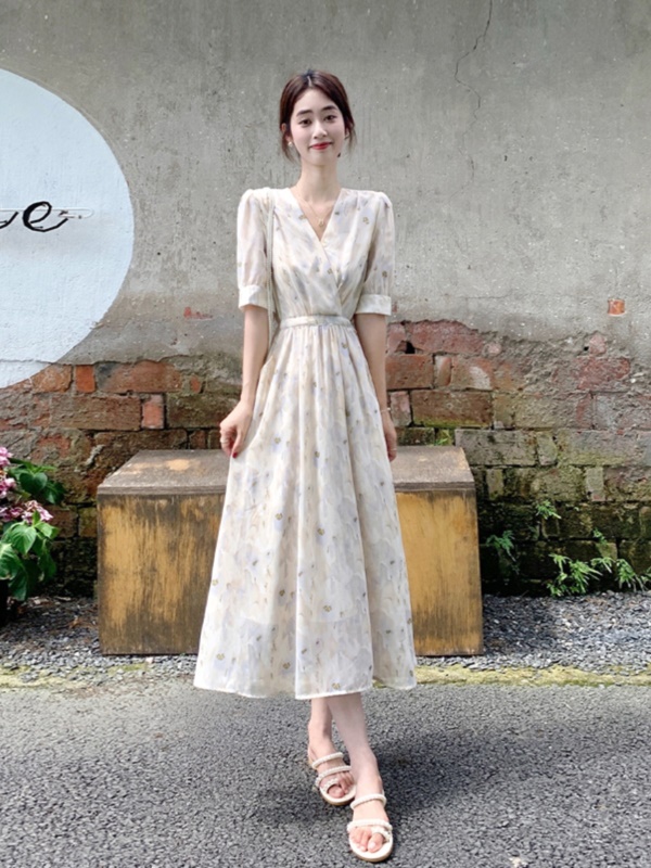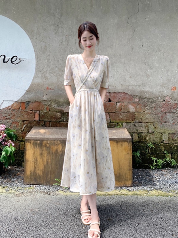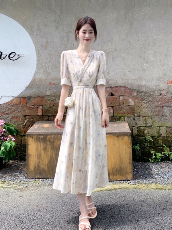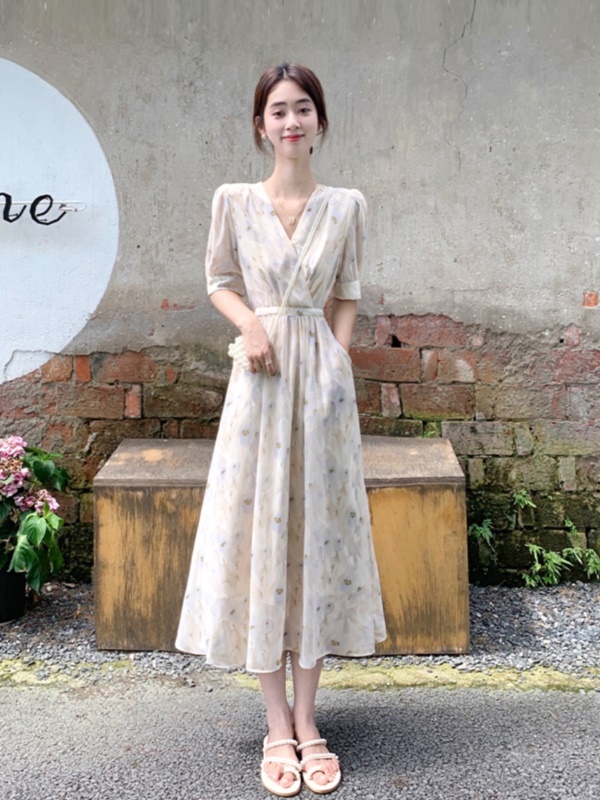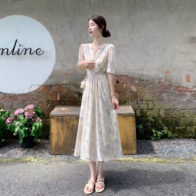 法式碎花雪纺连衣裙女夏季2025新款v领泡泡袖气质收腰显瘦a字裙子