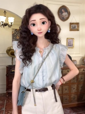 蓝色短袖衬衫女装夏季法式高级感气质雪纺衫小飞袖娃娃衫V领上衣