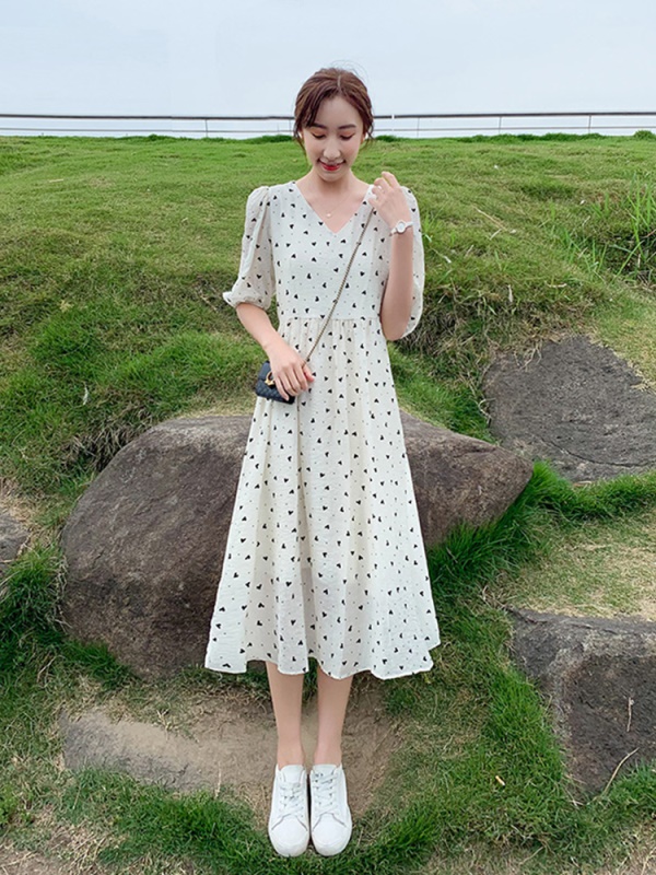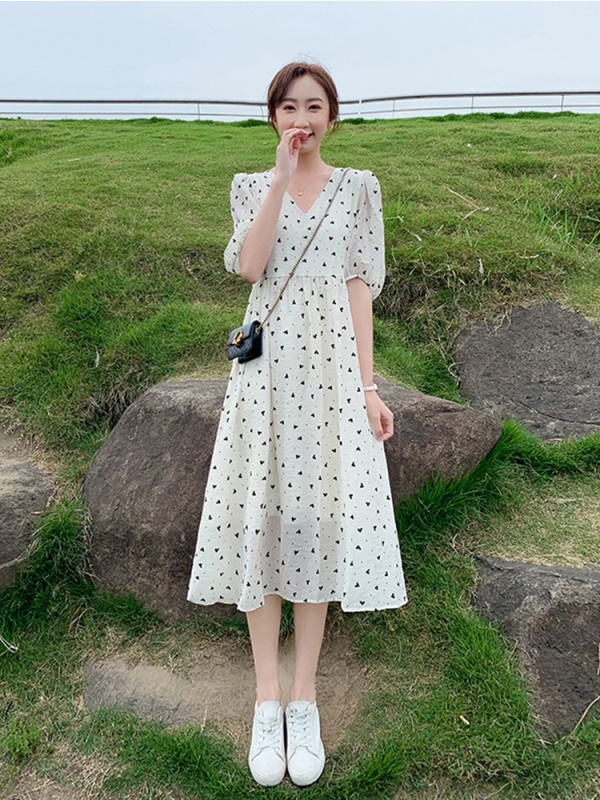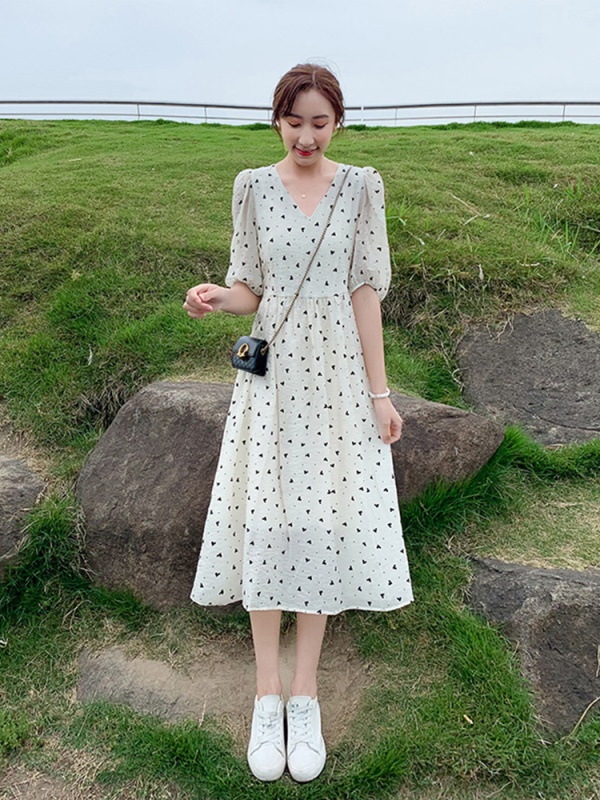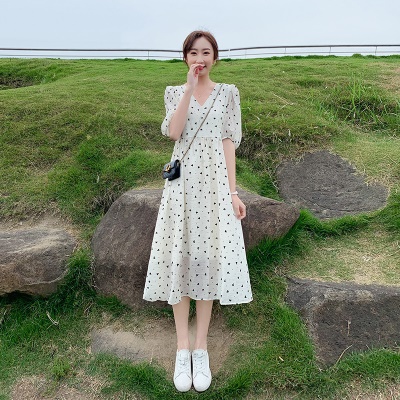 小个子米白色波点雪纺连衣裙女夏季2025新款气质显瘦v领a字裙子女