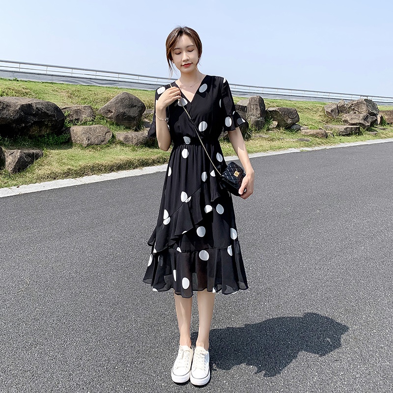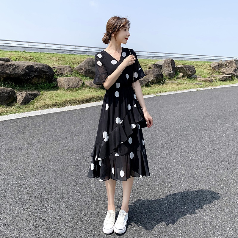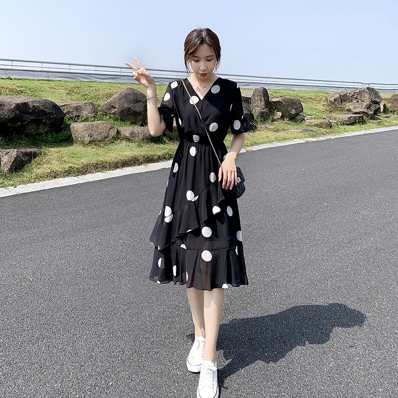 黑色波点雪纺连衣裙女夏天2025年新款气质收腰显瘦v领a字蛋糕裙子