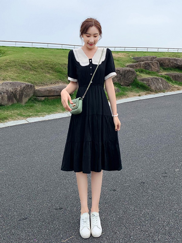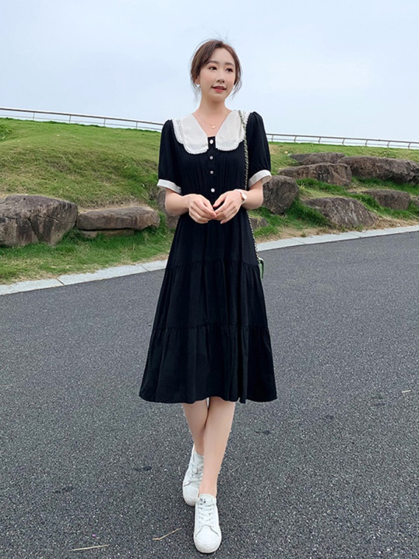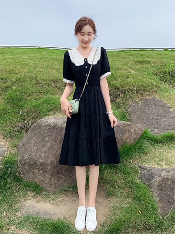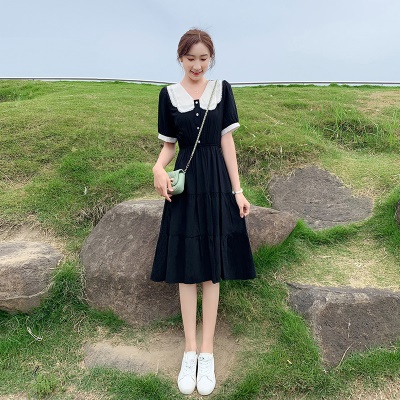 赫本风小个子黑色连衣裙女夏2025新款娃娃领气质显瘦雪纺a字裙子
