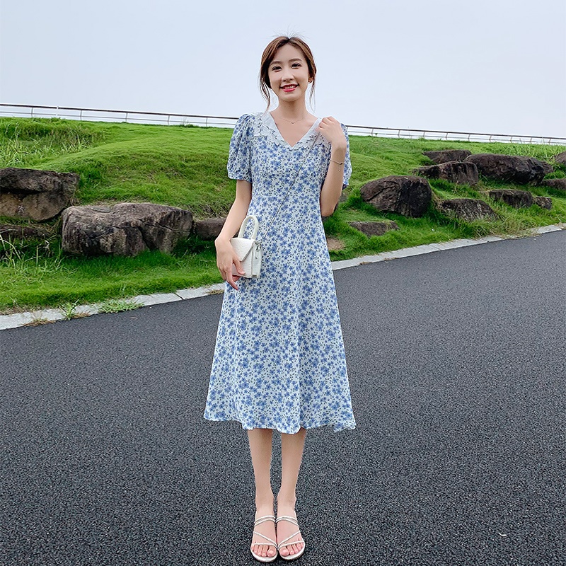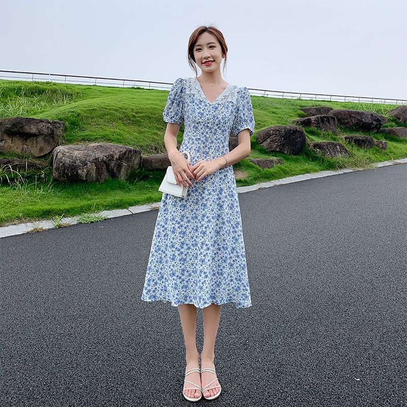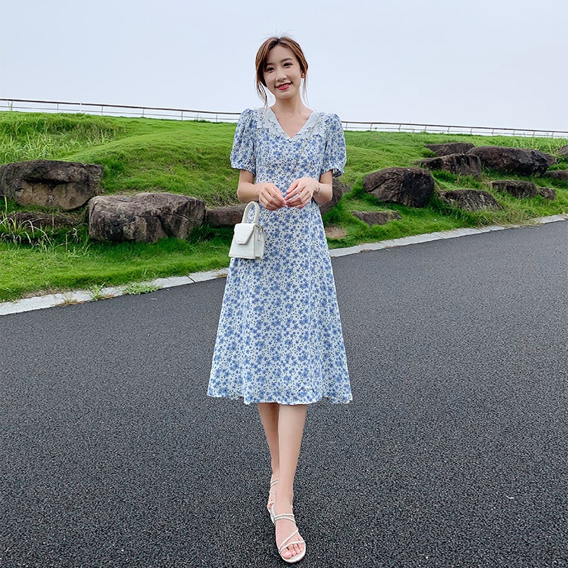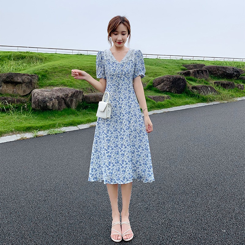 商品名称:娃娃领蓝色雪纺碎花连衣裙2025新夏显瘦泡泡袖收腰气质a字裙子女