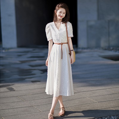 白色连衣裙女夏装法式纯棉气质名媛高级感夏季仙女V领长裙子夏天
