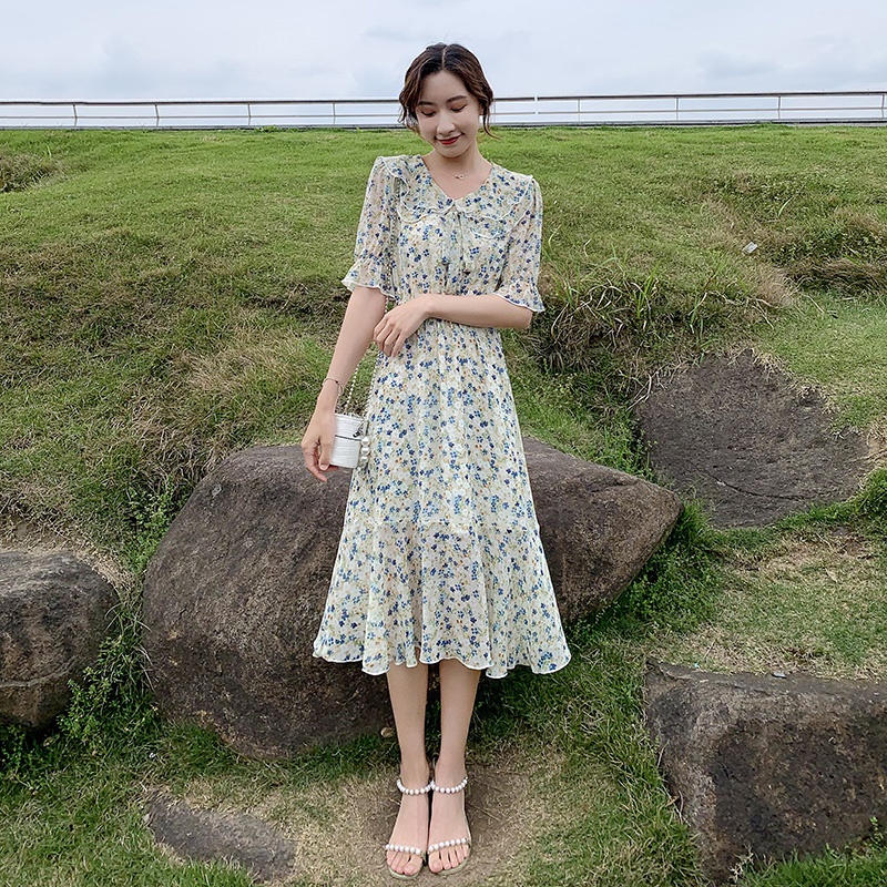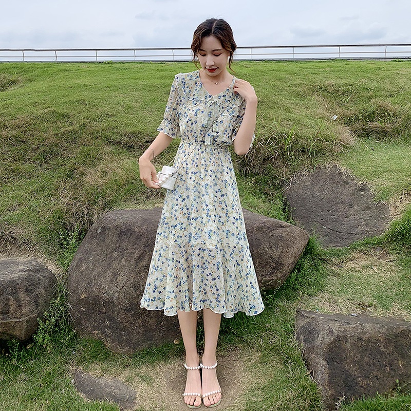 高级感雪纺碎花连衣裙女夏装2025新款收腰显瘦气质喇叭袖a字裙子