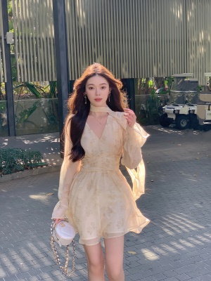 ByYou 夏季新款法式黄色碎花雪纺连衣裙喇叭袖大v领收腰短裙a字裙