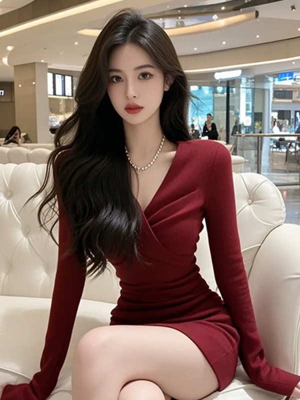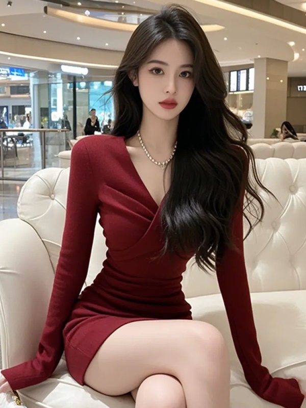 红色【连身裙/大衣内搭/针织连衣裙/冬天配大衣的裙子/法式/漂亮独特/修身/紧身/收腰/御姐风/性感/辣妹包臀/红色裙子/打底毛衣裙】