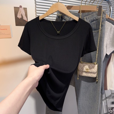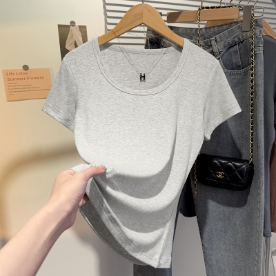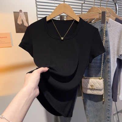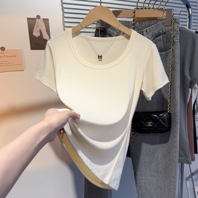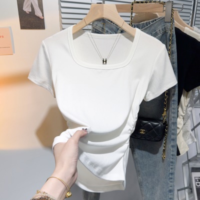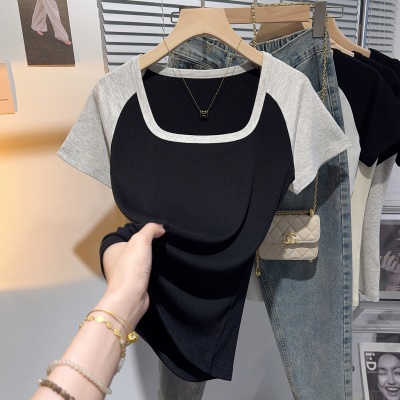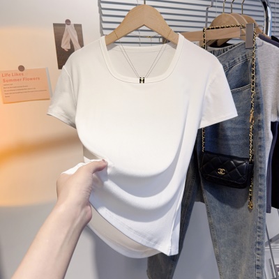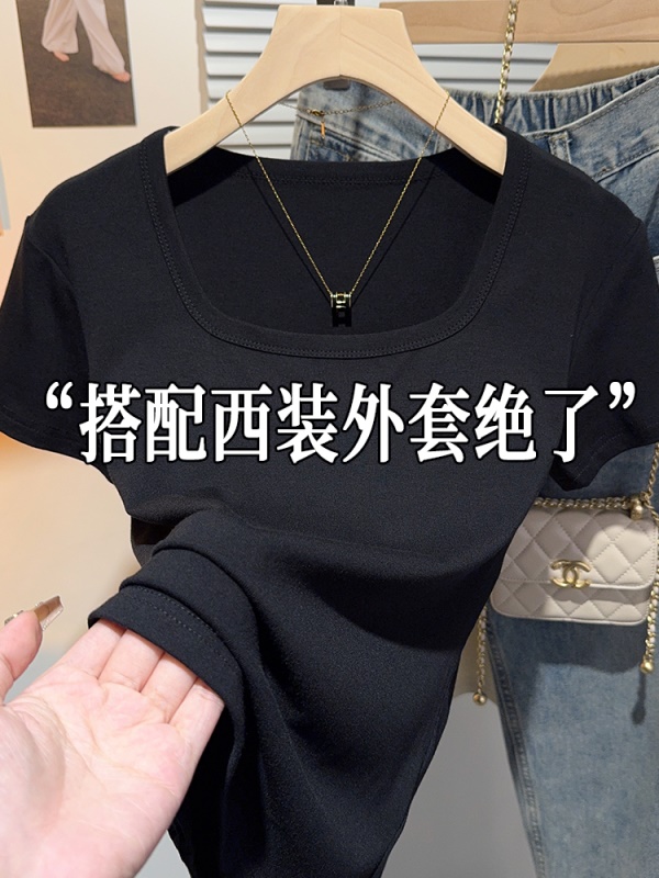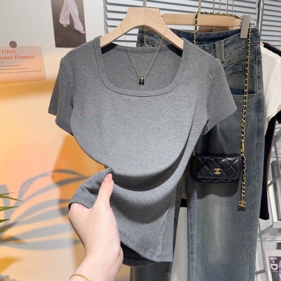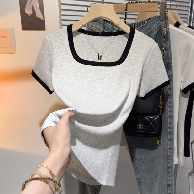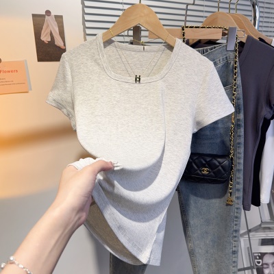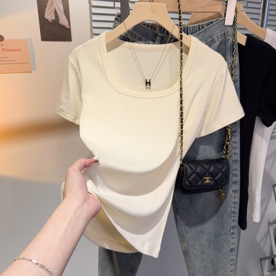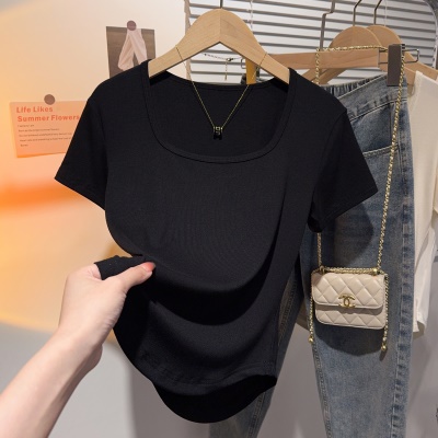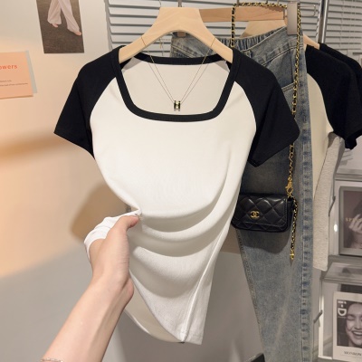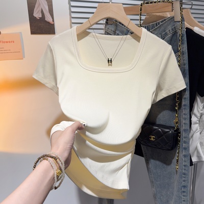 螺纹冰丝正肩方领短袖T恤女夏季新款多巴胺穿搭体恤短款低领上衣