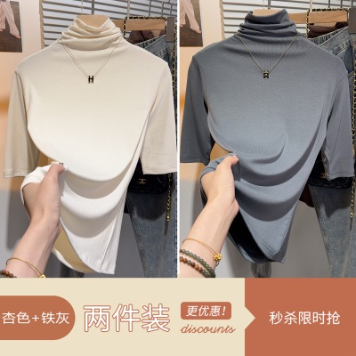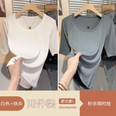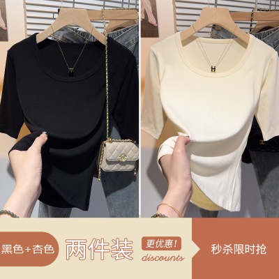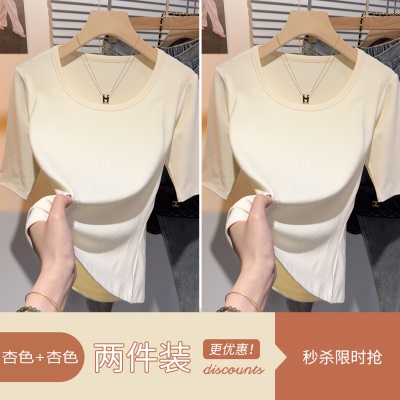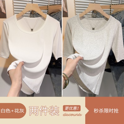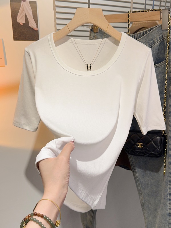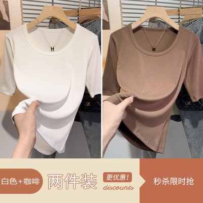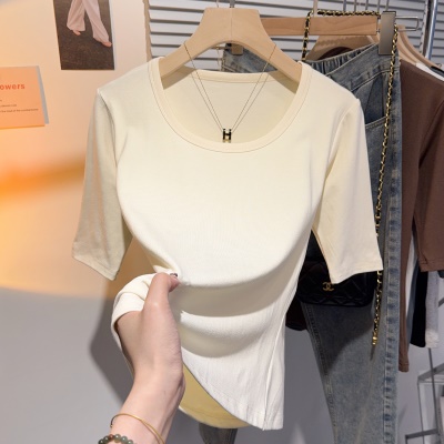 高级感甜美风中袖短袖T恤女夏正肩修身显瘦上衣u领百搭基础五分袖
