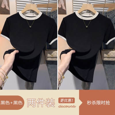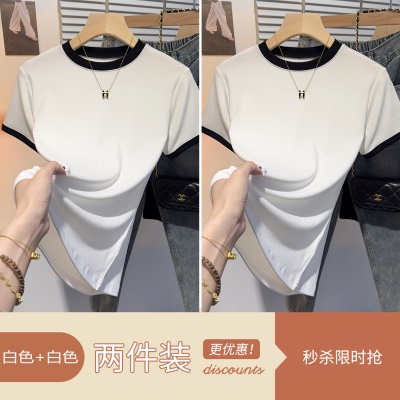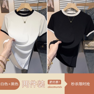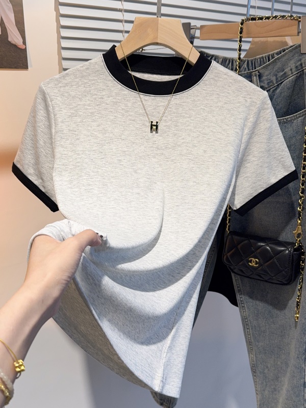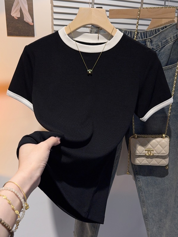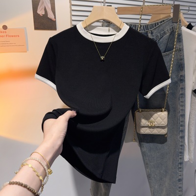 商品名称:2025夏季新款小圆领短袖撞色螺纹修身t恤女韩式穿搭高端百搭上衣