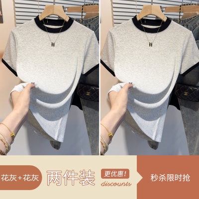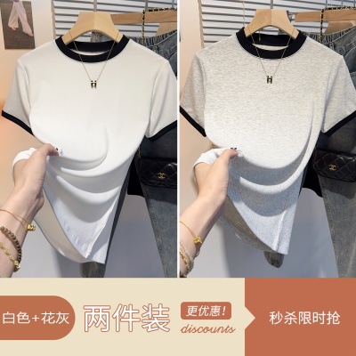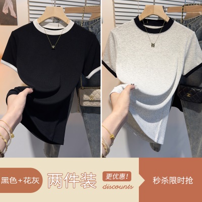 2025夏季新款小圆领短袖撞色螺纹修身t恤女韩式穿搭高端百搭上衣