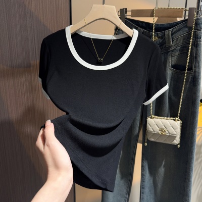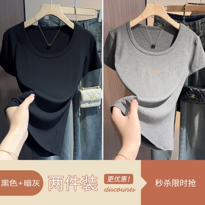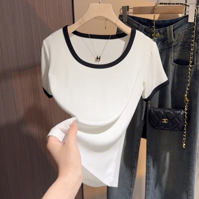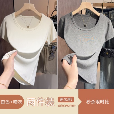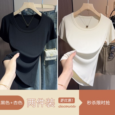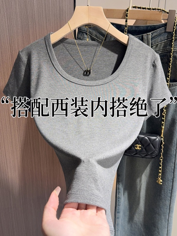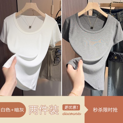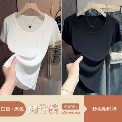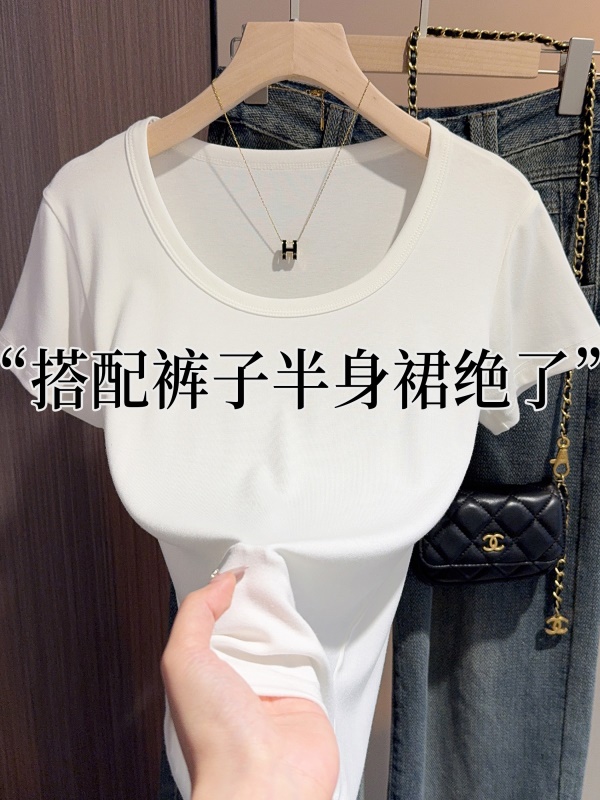 白色t恤女短袖2025年新款夏季修身螺纹高级感打底显瘦u领正肩上衣
