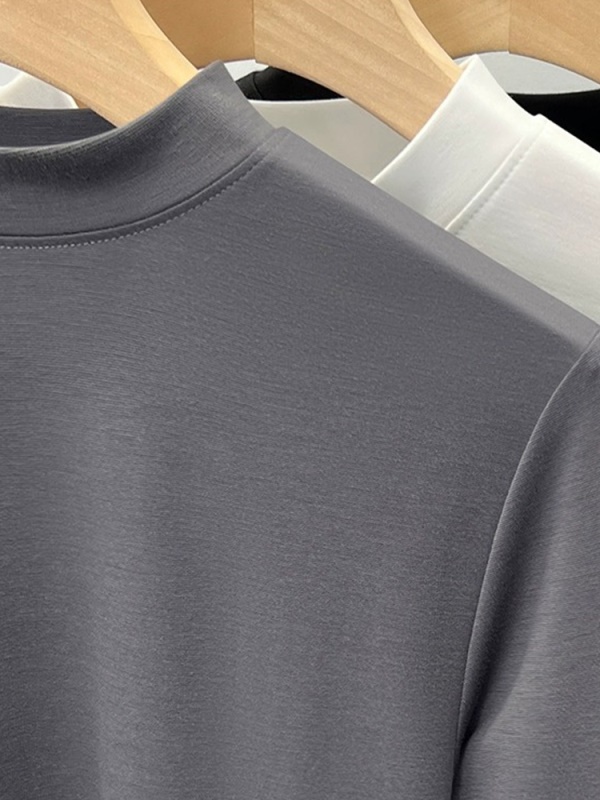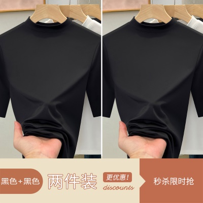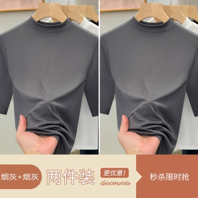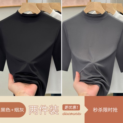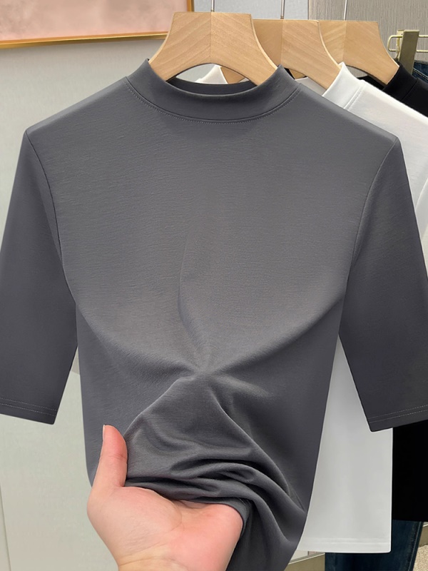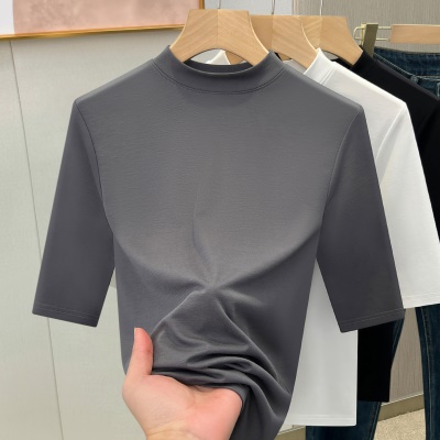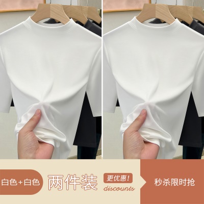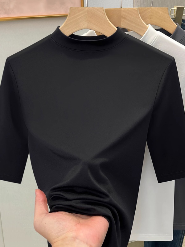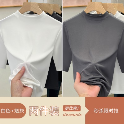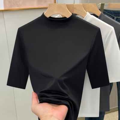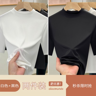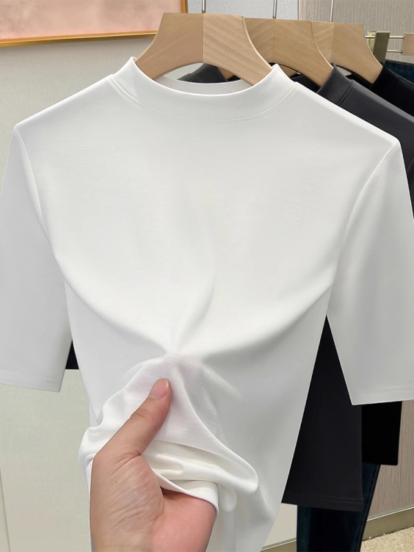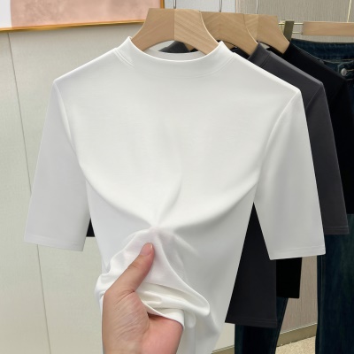 天丝白色半高领打底衫女2025新款修身显瘦正肩T恤春夏中袖上衣潮