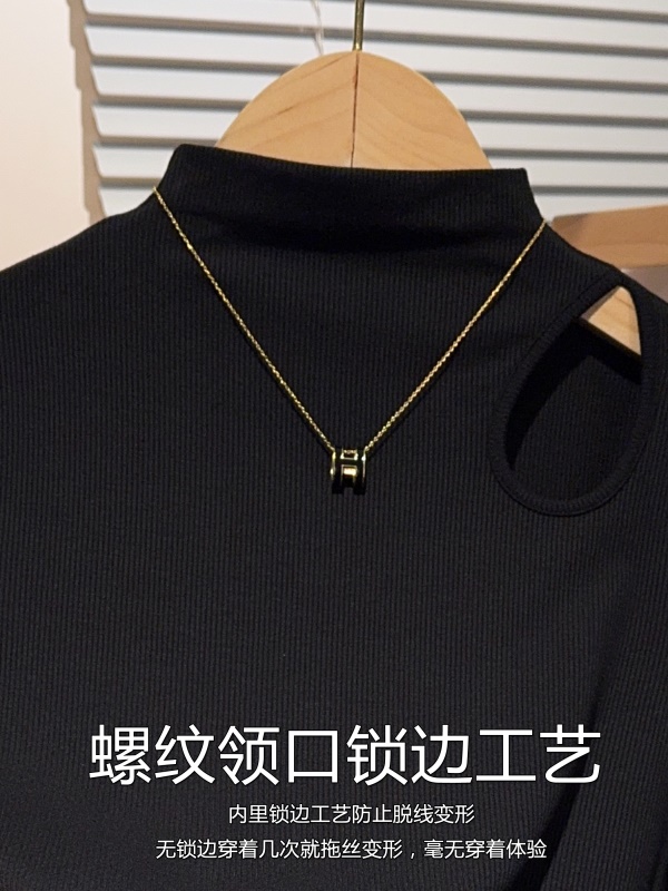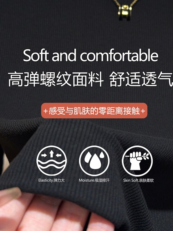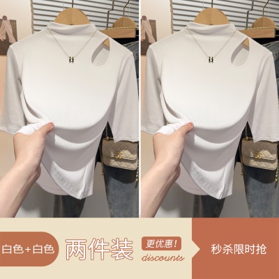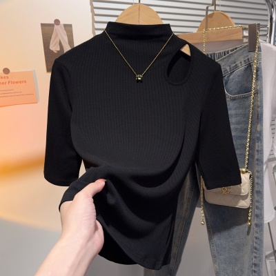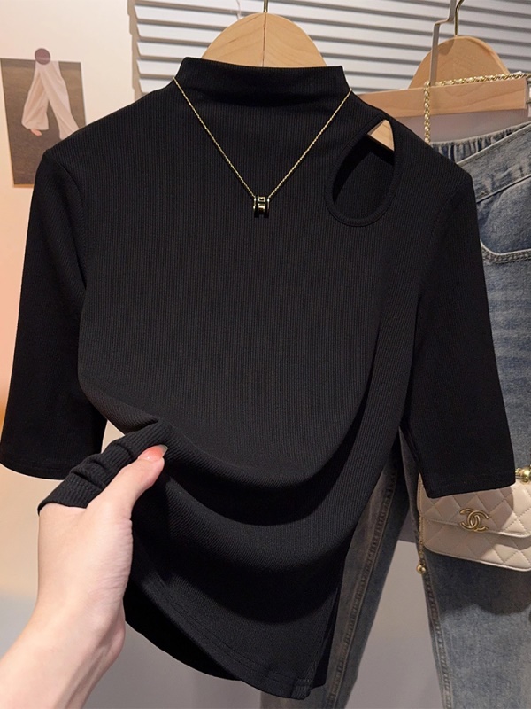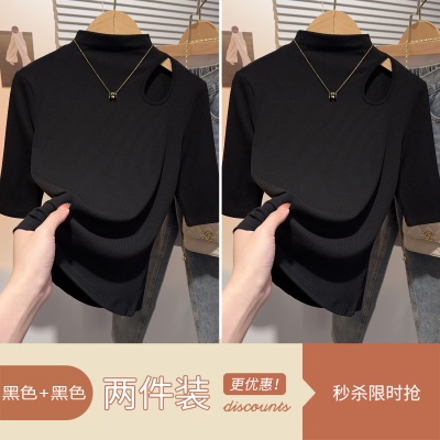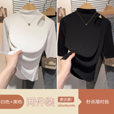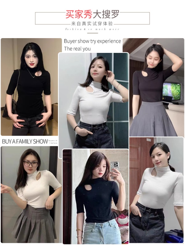 商品名称:独特别致螺纹中袖t恤半高领打底衫女2025夏季短款五分袖镂空上衣