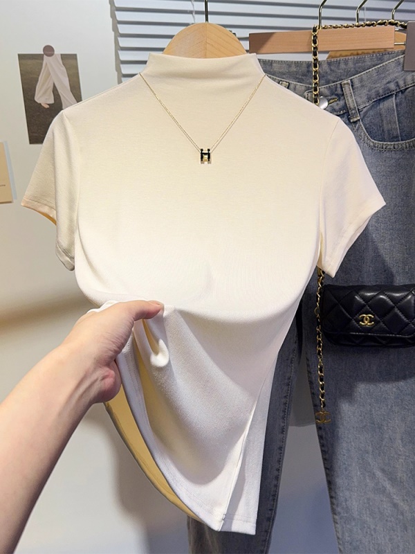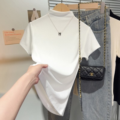 商品名称:螺纹针织半高领短袖t恤女修身显瘦夏季新款正肩打底衫高品质上衣