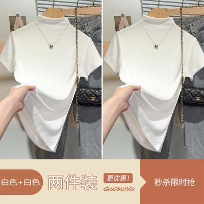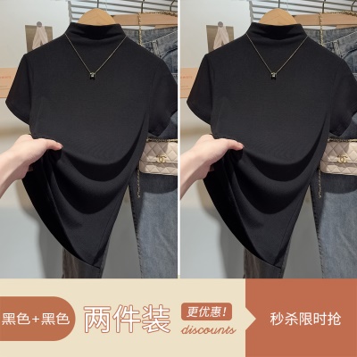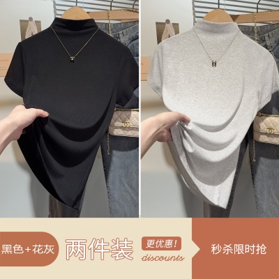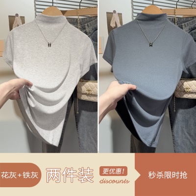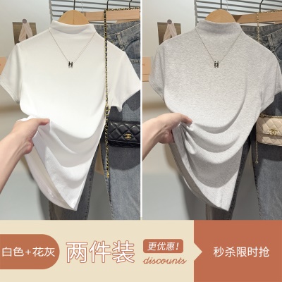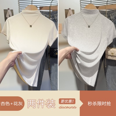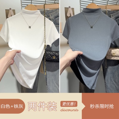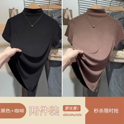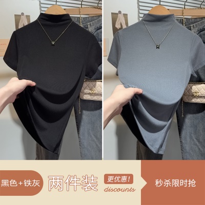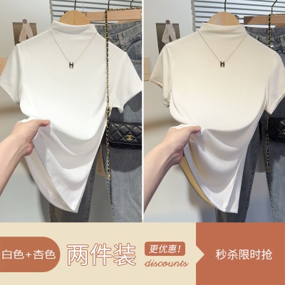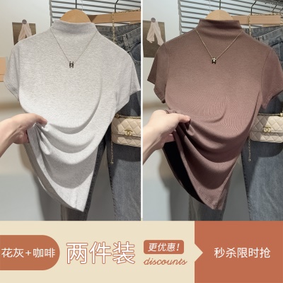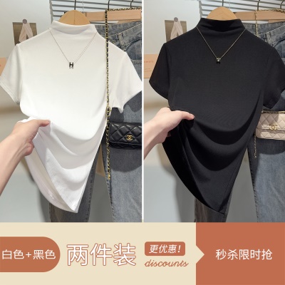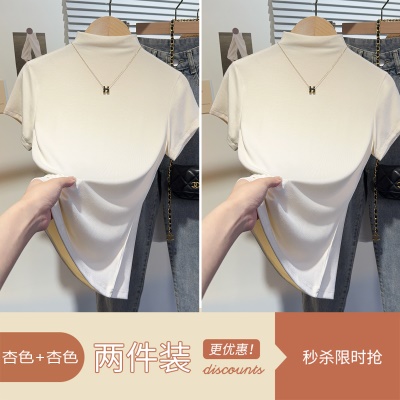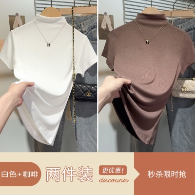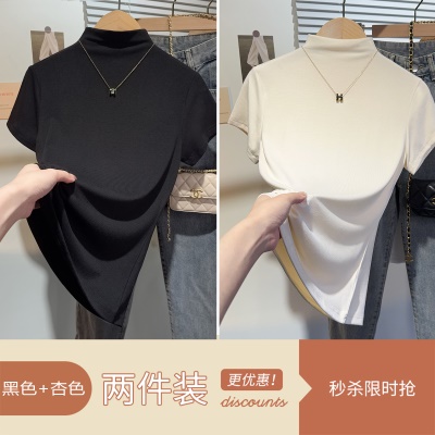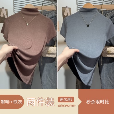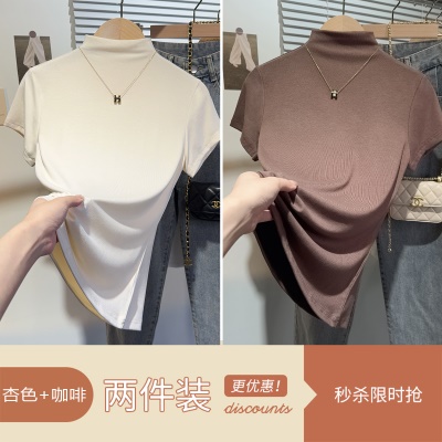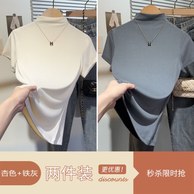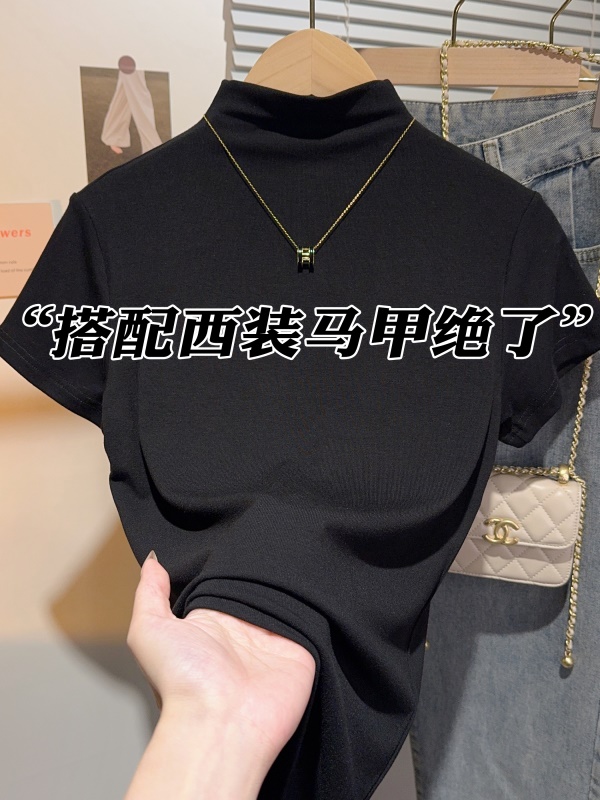 螺纹针织半高领短袖t恤女修身显瘦夏季新款正肩打底衫高品质上衣