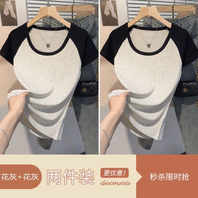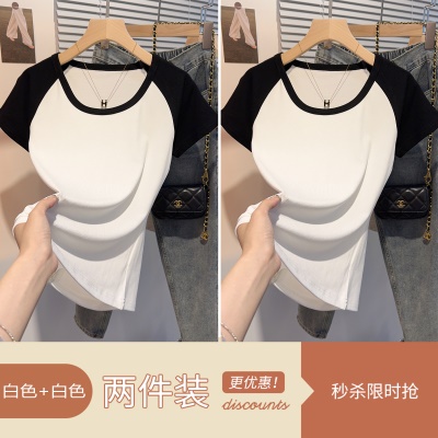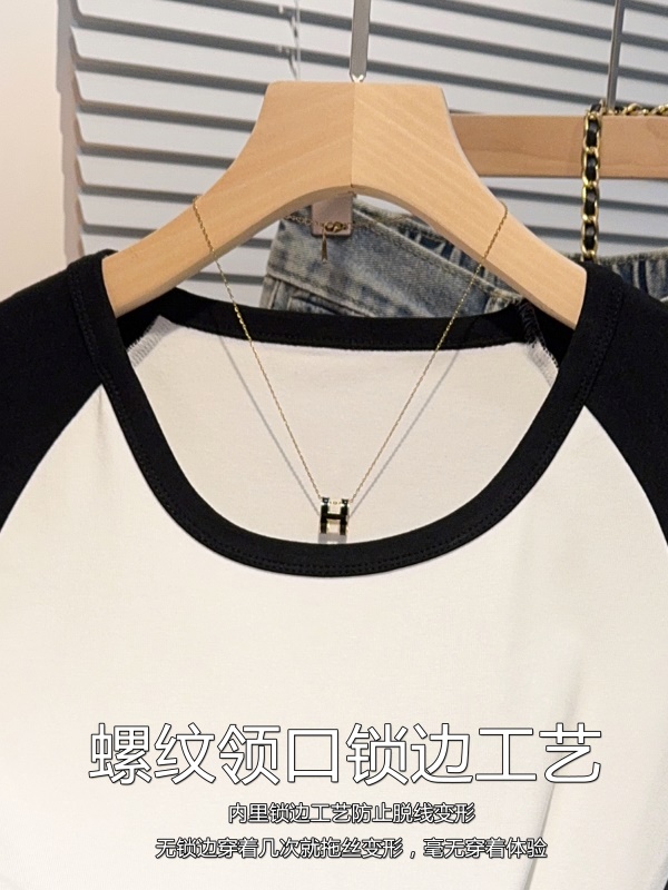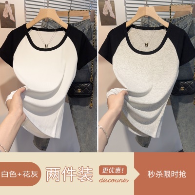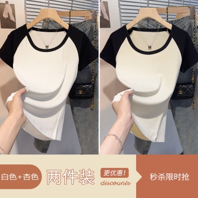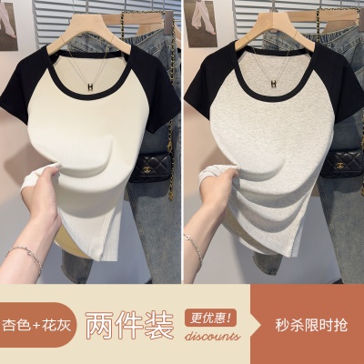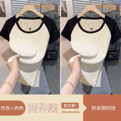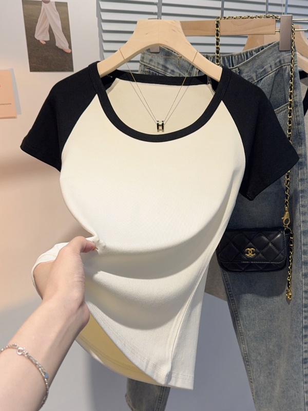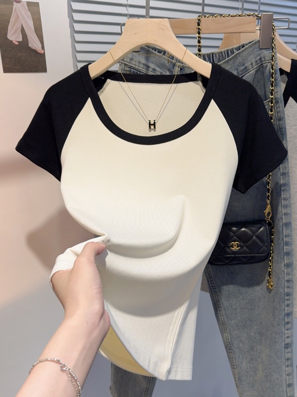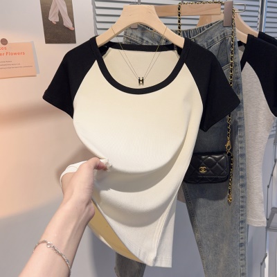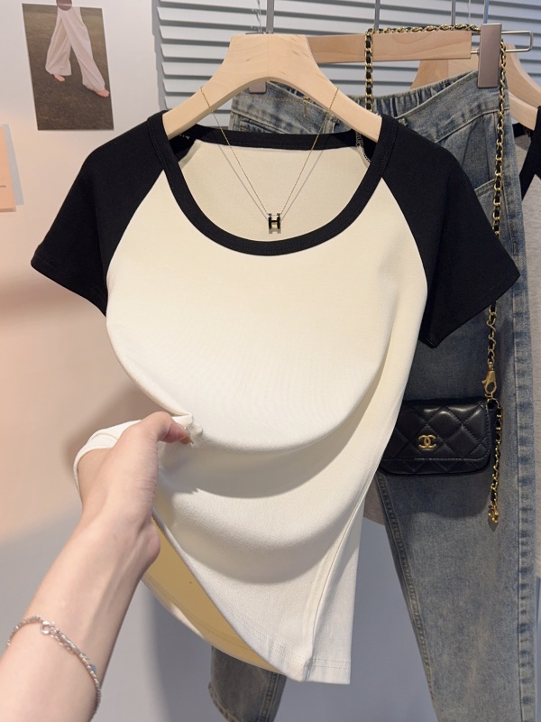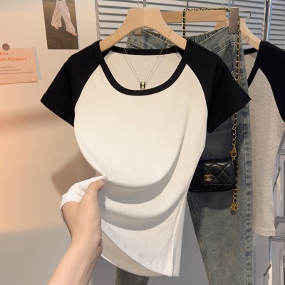 撞色插肩u领短袖T恤女2025新款高端独特气质上衣螺纹修身百搭拼接
