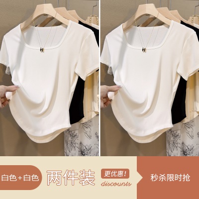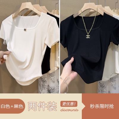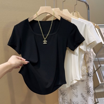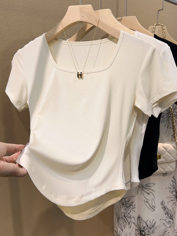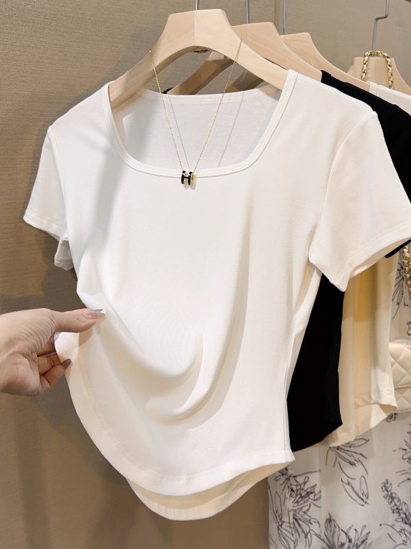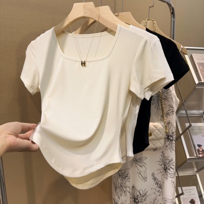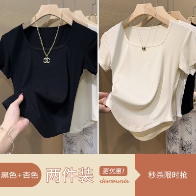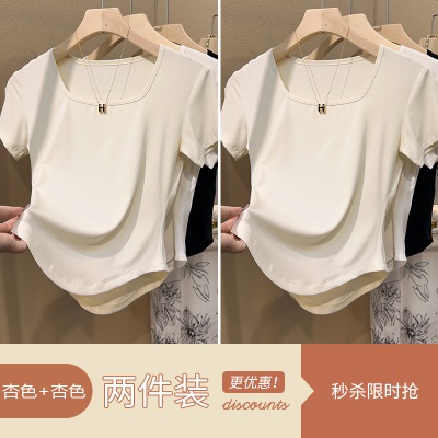 杏色莫代尔冰丝短袖t恤女夏百搭弧形下摆修身收腰不规则短款上衣
