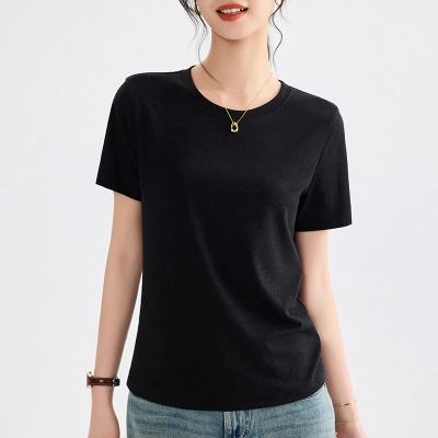天丝黑色中袖t恤女春夏季修身百搭欧货2025新款高级感气质上衣潮