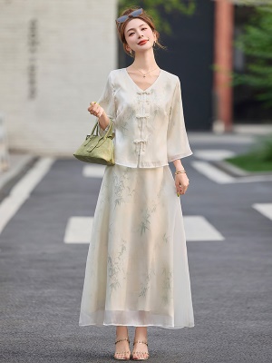 新中式国风雪纺套装女2025夏新款复古印花七分袖文艺半身裙两件套