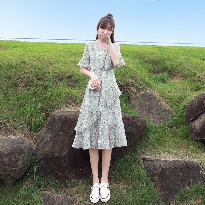 小清新雪纺碎花连衣裙女2025新款夏天收腰显瘦气质v领蛋糕a字裙子