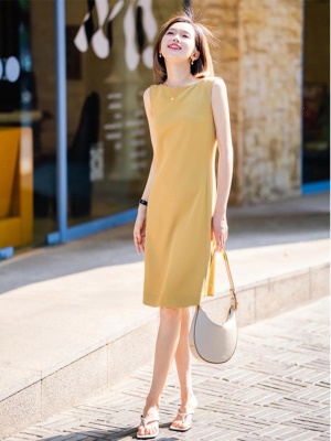 御姐风职业黄色无袖背心连衣裙女夏气质名媛高端女神范高级感裙子