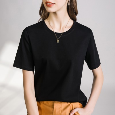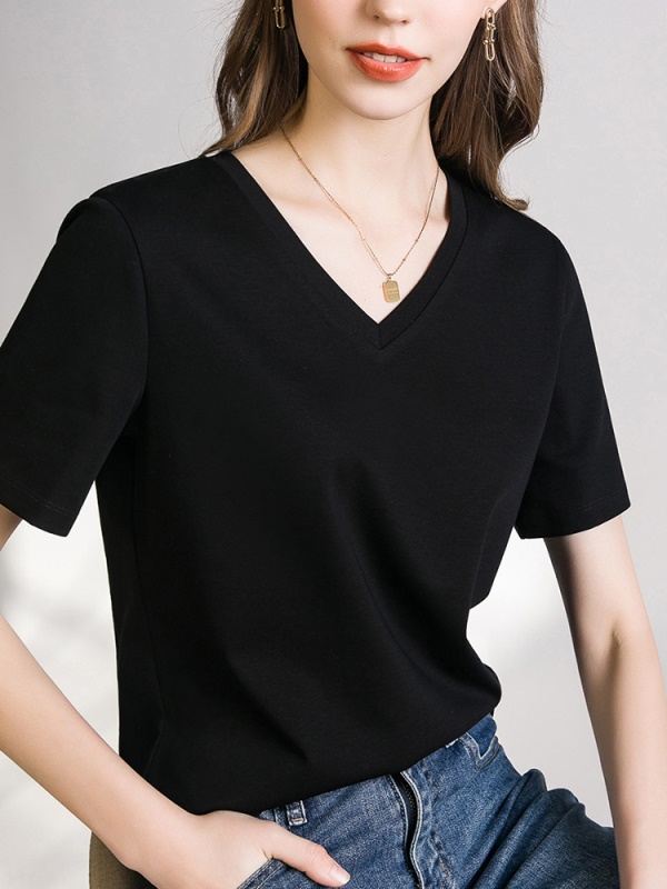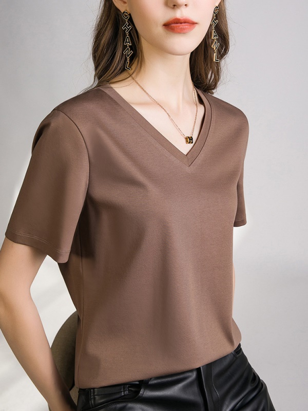 商品名称:80s液氨卡其色短袖正肩t恤女2025春夏丝光棉V领气质打底衫体恤潮