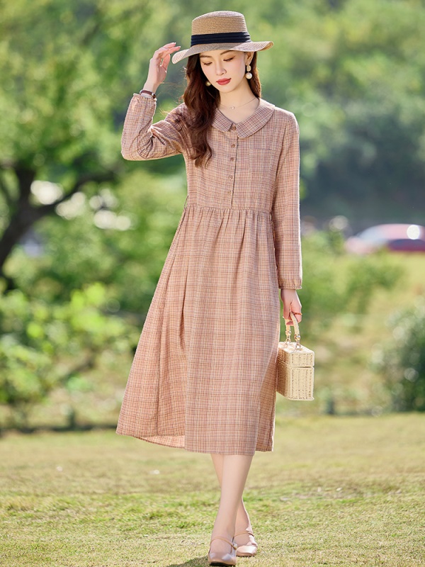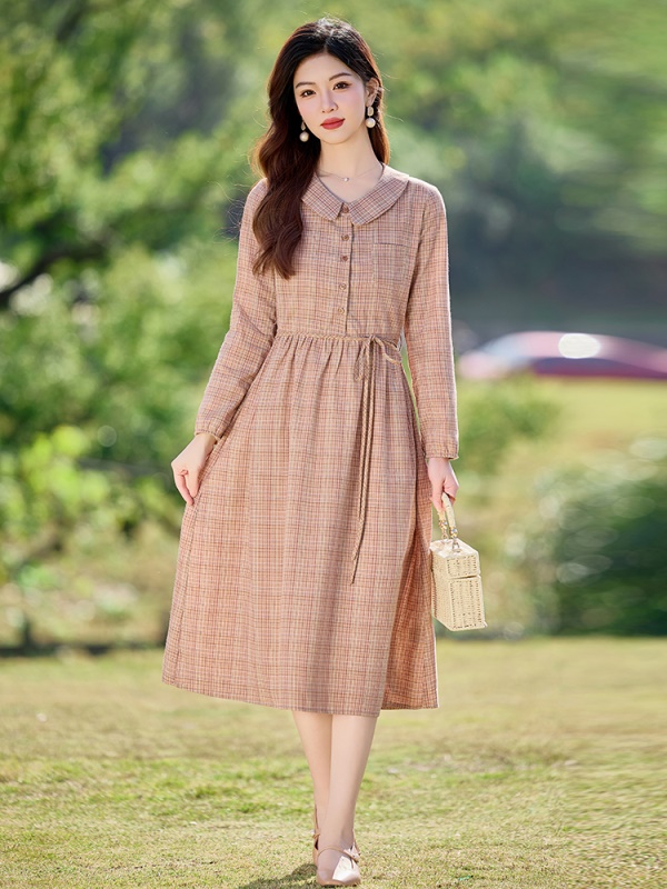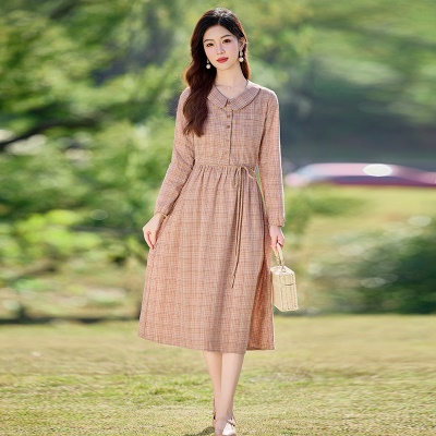 商品名称:纯棉格纹小香风连衣裙女2025春季新款翻领收腰温柔风文艺衬衫长裙