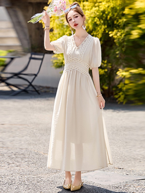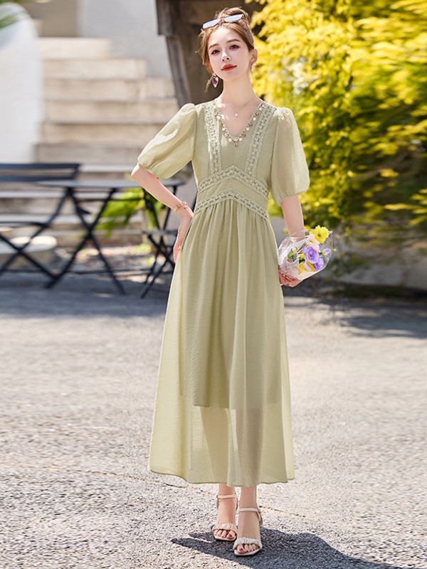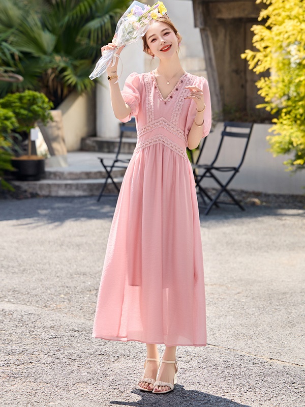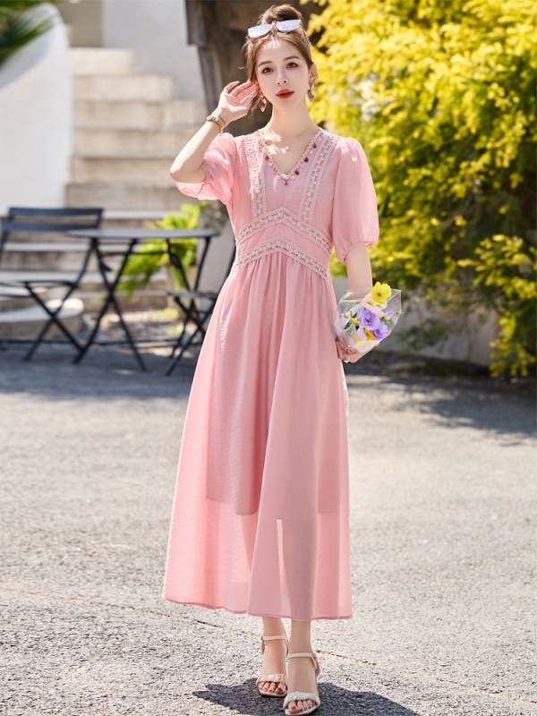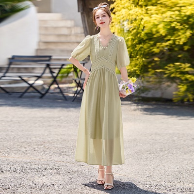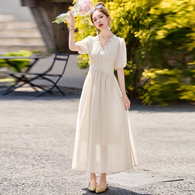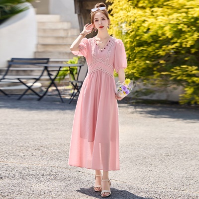 商品名称:民族风雪纺连衣裙女2025夏季新款气质蕾丝拼接V领高腰仙女风长裙