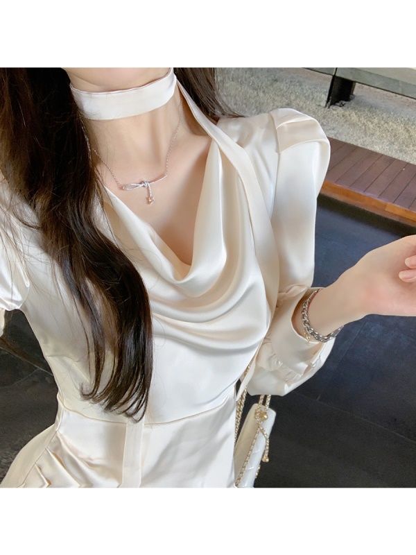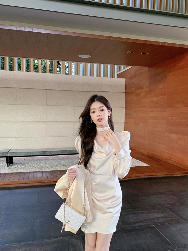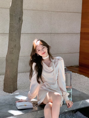 商品名称:ByYou 夏季高端精致法式长袖白色荡领缎面连衣裙收腰气质显瘦短裙