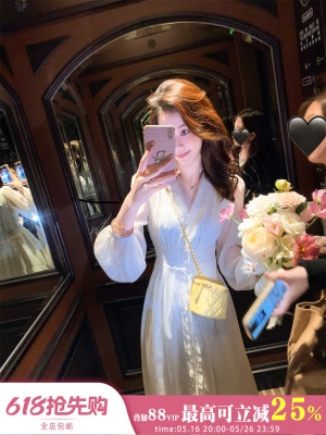 「白月光」珍珠蕾丝拼接长裙女春季新款v领法式裙子