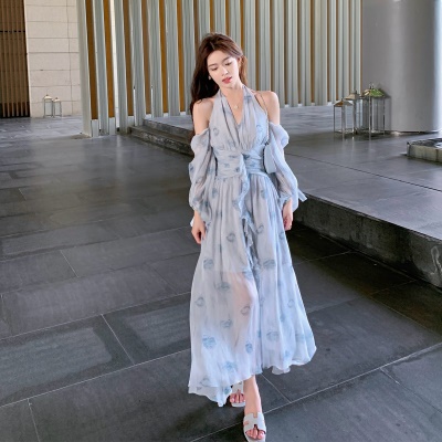 ByYou 夏季新款气质蓝色雪纺露肩挂脖碎花连衣裙收腰薄款V领长裙