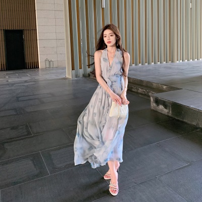 商品名称:ByYou 夏季新款气质蓝色雪纺露肩挂脖碎花连衣裙收腰薄款V领长裙