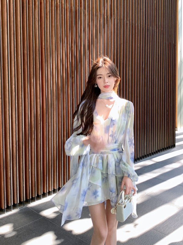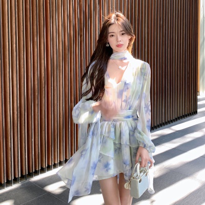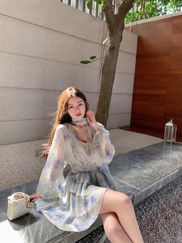 ByYou夏季新款灯笼袖V领碎花雪纺连衣裙不规则收腰短款印花荷叶裙