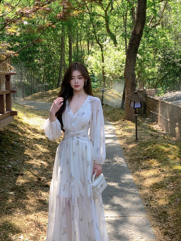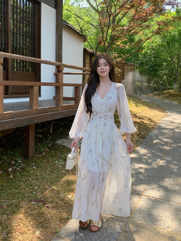 ByYou 夏季新款荷叶领灯笼袖白色雪纺碎花连衣裙收腰显瘦掐腰长裙