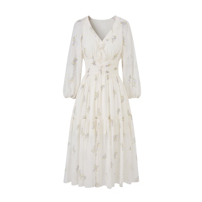 商品名称:ByYou 夏季新款荷叶领灯笼袖白色雪纺碎花连衣裙收腰显瘦掐腰长裙