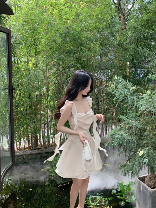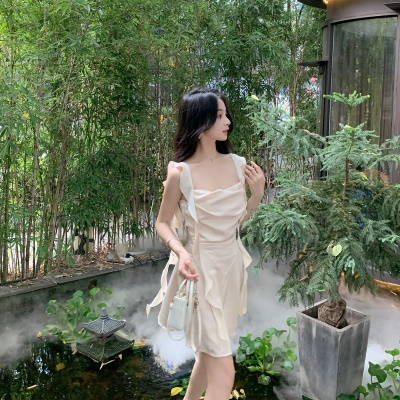 商品名称:ByYou 夏季新款杏色缎面吊带连衣裙女气质收腰显瘦设计感飘带短裙