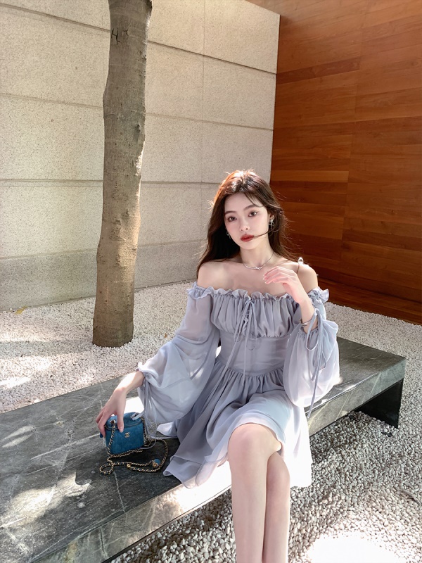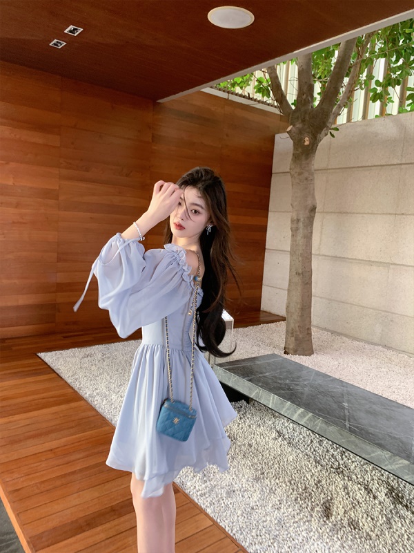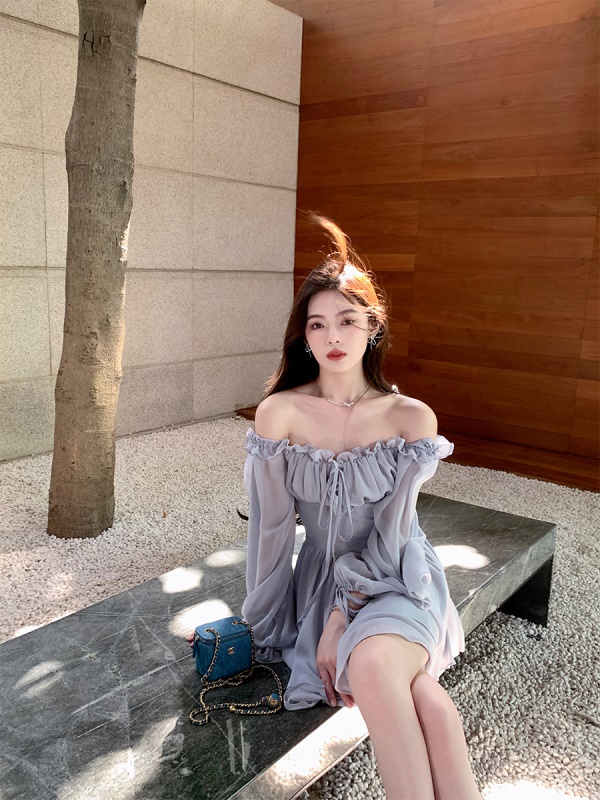 商品名称:ByYou 2025新款法式一字肩雪纺连衣裙短款灯笼袖木耳边收腰仙女裙