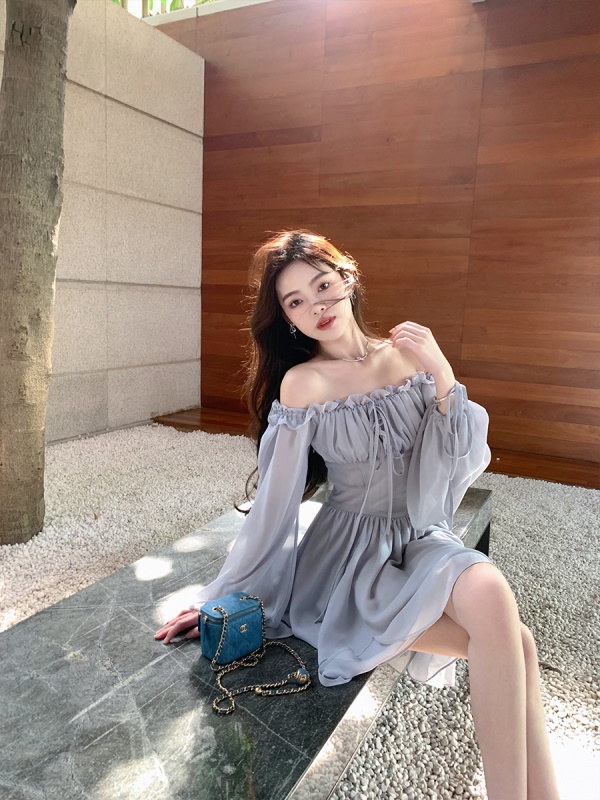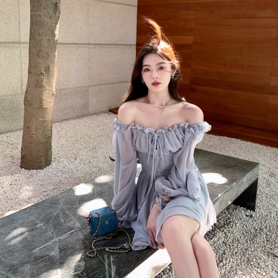 ByYou 2025新款法式一字肩雪纺连衣裙短款灯笼袖木耳边收腰仙女裙