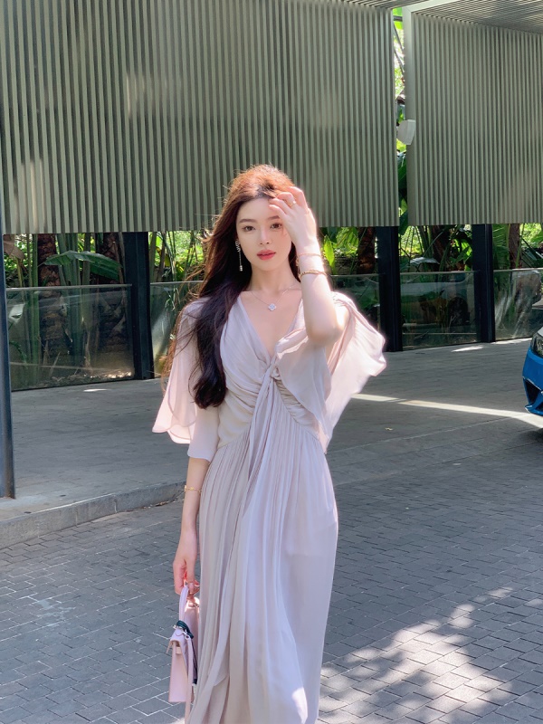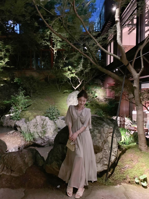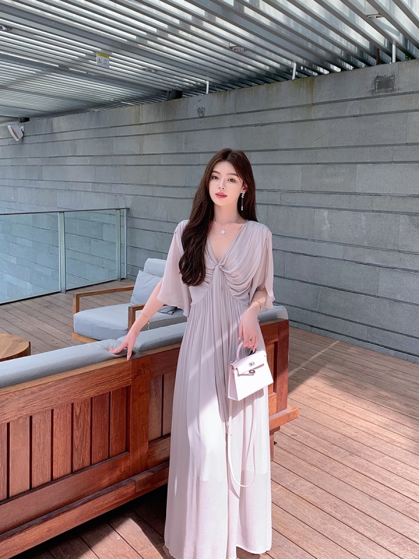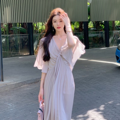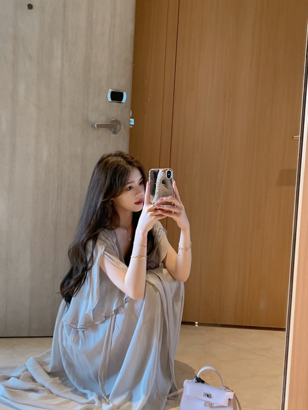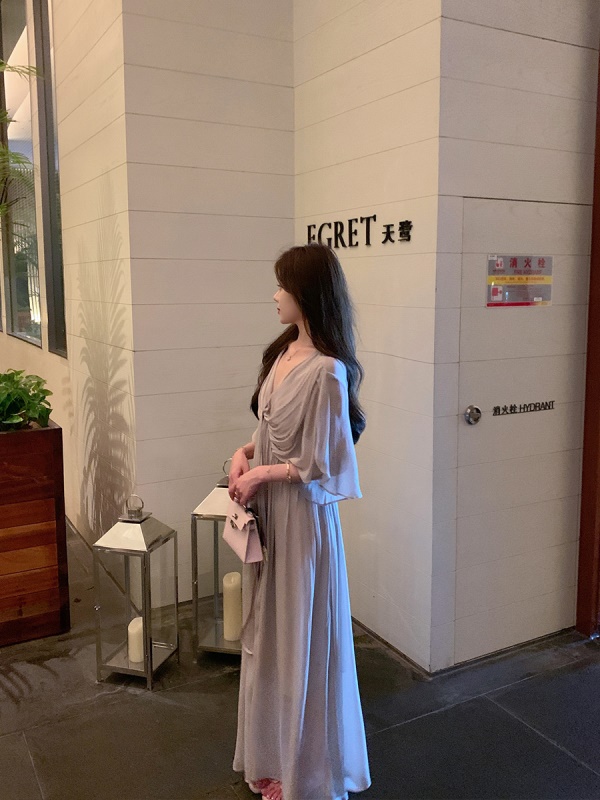 商品名称:ByYou 2025新款温柔风灰色荷叶袖v领收腰连衣裙大摆宽松气质长裙