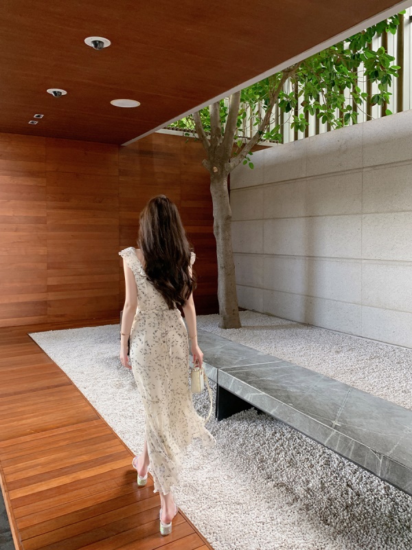 商品名称:ByYou 夏季新款杏色小飞袖方领雪纺碎花连衣裙长款显瘦包臀鱼尾裙