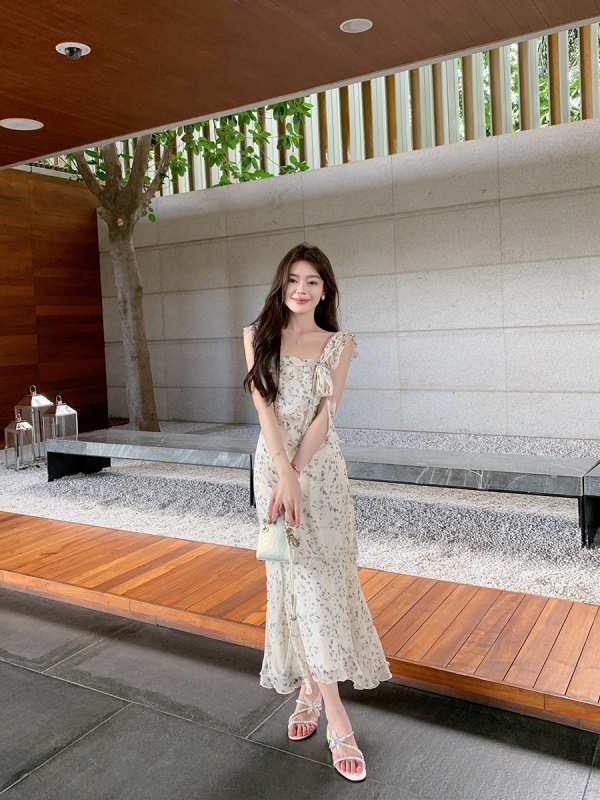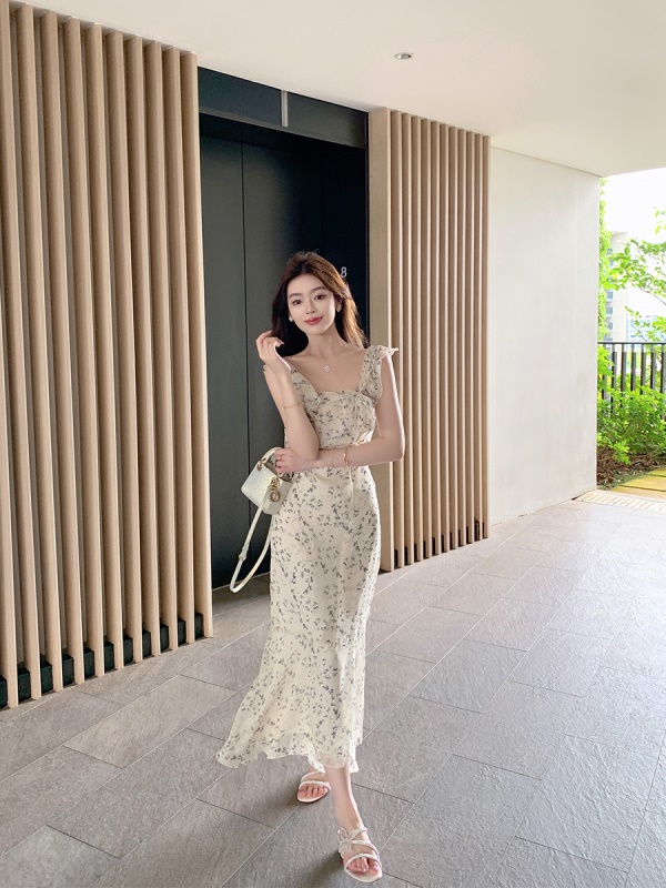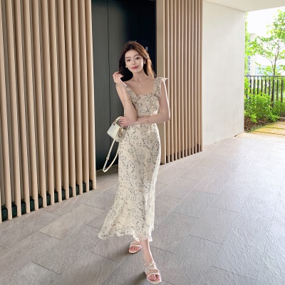 ByYou 夏季新款杏色小飞袖方领雪纺碎花连衣裙长款显瘦包臀鱼尾裙